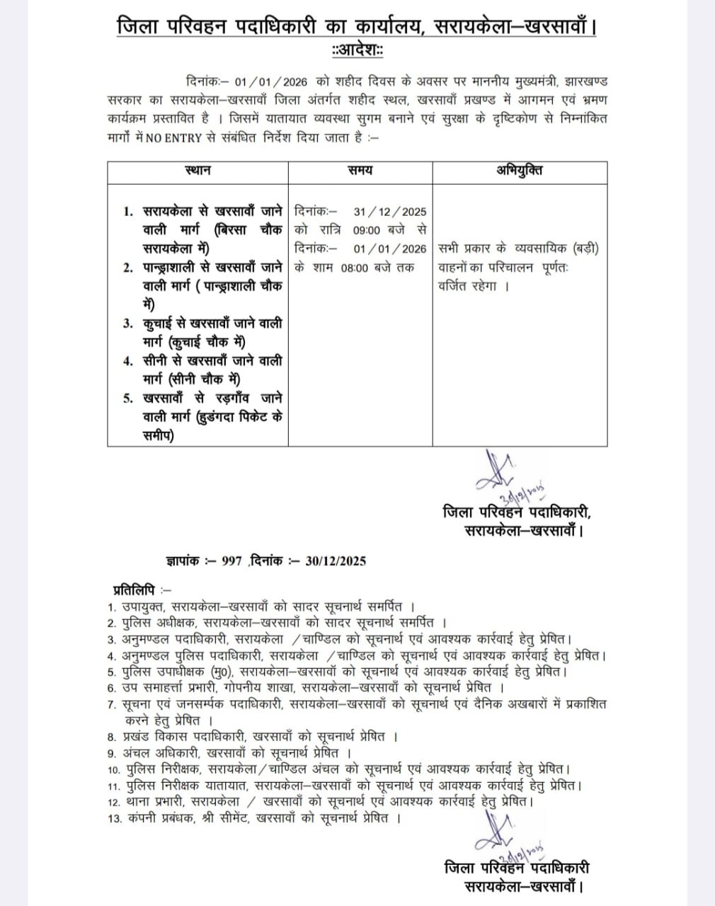 Saraikela: 1 जनवरी 2026 को खरसावां शहीद स्थल के कार्यक्रम के मद्देनजर डीटीओ सरायकेला गिरजा शंकर महतो ने नो इंट्री का शिड्यूल जारी किया है. बता दें कि उस दिन शहीद दिवस के अवसर पर माननीय मुख्यमंत्री का सरायकेला-खरसावाँ जिला अंतर्गत शहीद स्थल खरसावाँ प्रखण्ड में आगमन का कार्यक्रम प्रस्तावित है. जिसमें यातायात व्यवस्था सुगम बनाने एवं सुरक्षा के दृष्टिकोण से नो इंट्री से संबंधित निर्देश जारी किया गया है. इस दौरान सरायकेला से खरसावाँ जाने वाली मार्ग में बिरसा चौक सरायकेला में पान्ड्राशाली से खरसावाँ जाने वाली मार्ग (पान्ड्राशाली चौक में) 31/12 /2025 को रात्रि 09:00 बजे से ही दिनांक: 01/01/2026 के शाम 08:00 बजे तक सभी प्रकार के व्यवसायिक (बड़ी) वाहनों का परिचालन पर्णतः वर्जित रहेगा. इसके अलावा कुचाई से खरसावाँ मार्ग (कुचाई चौक में) सीनी से खरसावाँ जाने मार्ग में और सीनी चौक में खरसावाँ से रडगाँव वाली मार्ग (हडंगदा पिकेट) स्थल तक भी नो इंट्री लगाई गई है. यह आदेश जिला परिवहन पदाधिकारी गिरजा शंकर महतो द्वारा जारी किया गया |