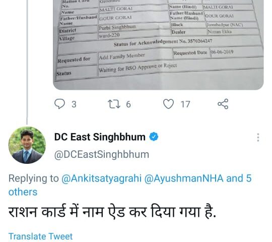 जमशेदपुर :- टेल्को के खड़ंगाझार बाज़ार में सब्जी बेचकर आजीविका चलाने वाली मालती गोराई का उपायुक्त सूरज कुमार के निर्देश के बाद राशनकार्ड बन गया…