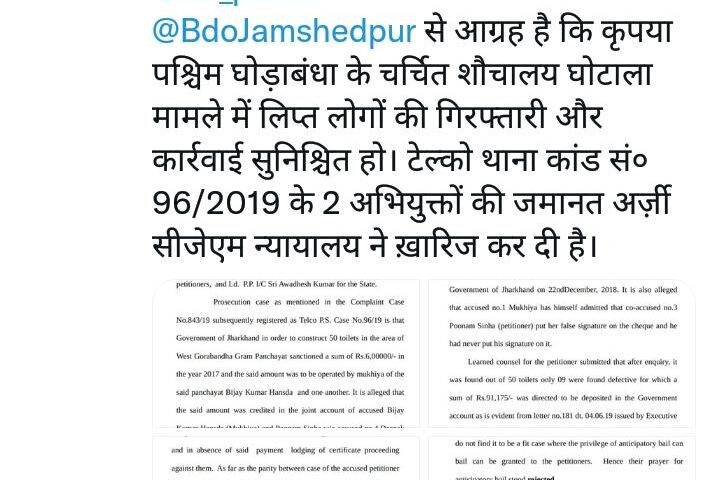 जमशेदपुर :- पश्चिम घोड़ाबंधा पंचायत के चर्चित शौचालय घोटाला मामले में अभियुक्त जल सहिया पूनम सिन्हा और उनके पति दीपक सिन्हा की जमानत याचिका रद्द…