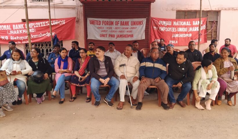 बैंक हड़ताल के समर्थन में बिष्टुपुर में प्रदर्शन, कर्मचारियों ने रखीं अपनी मांगें