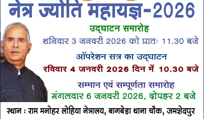 View More 3 से 6 जनवरी तक 800वां नेत्र ज्योति महायज्ञ 2026 का आयोजनजमशेदपुर की अंजलि सिन्हा ने जीता ‘मिसेज इंडिया 2025’ का खिताब, मानगो में भव्य स्वागत, जयपुर में लहराया जमशेदपुर का परचम