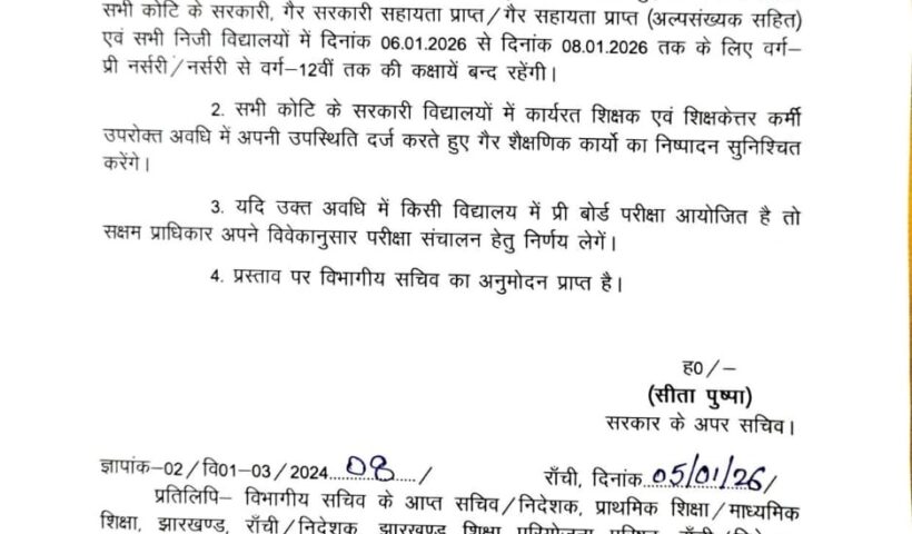 Saraikela: 6 जनवरी से 8 जनवरी तक सभी प्रकार के स्कूलों में कक्षा 12वीं तक पठन पाठन कार्य को रद्द करने का आदेश जारी…