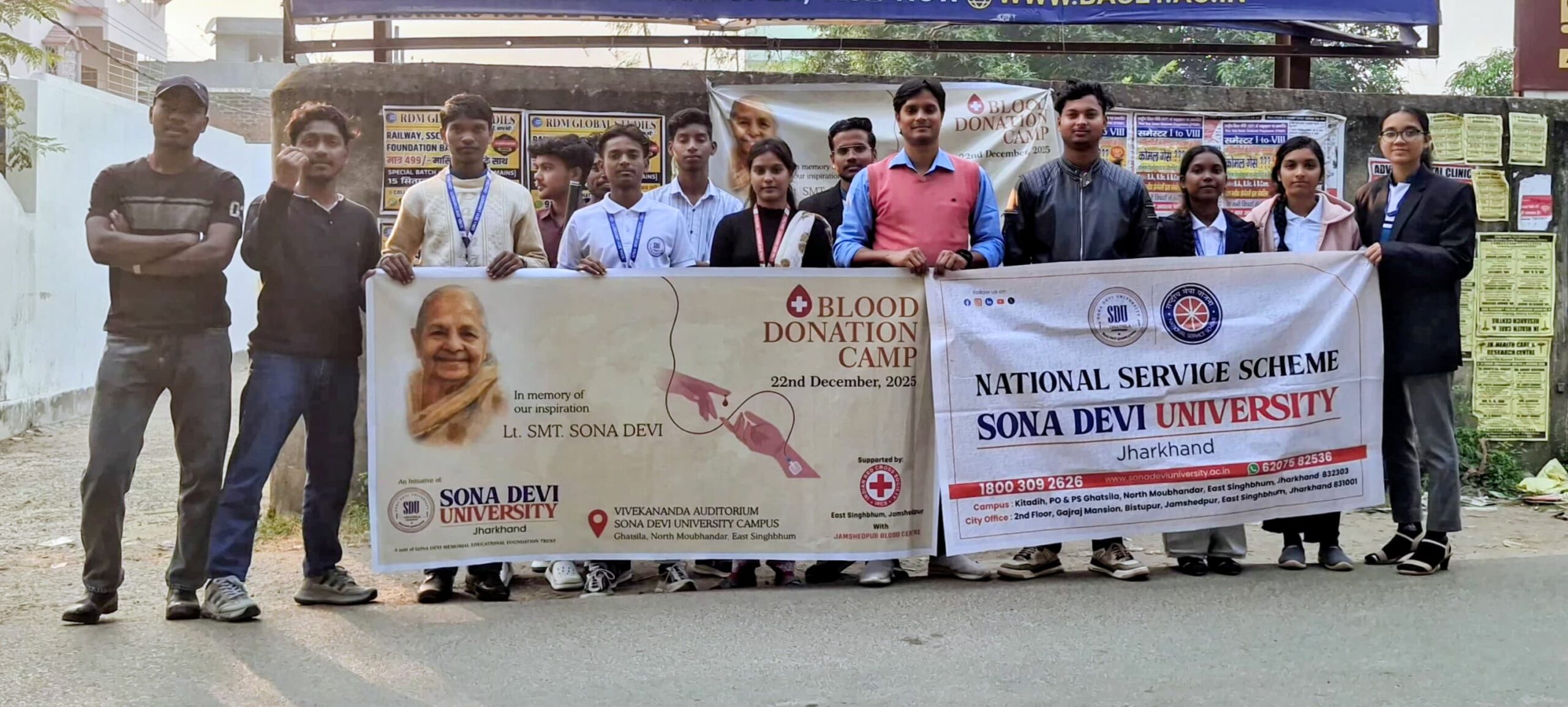 घाटशिला : सोना देवी विश्वविद्यालय, घाटशिला, झारखंड में दिनांक 22 दिसंबर 2025 को आयोजित होने वाले विशाल रक्तदान शिविर को सफल बनाने के उद्देश्य से विश्वविद्यालय की राष्ट्रीय सेवा योजना (NSS) इकाई द्वारा निरंतर एवं सघन जनजागरूकता गतिविधियाँ संचालित की जा रही हैं। इसी क्रम में NSS के स्वयंसेवकों द्वारा की फुलडुंगरी, घाटशिला कॉलेज रोड क्षेत्र में एक विशेष जनजागरूकता कार्यक्रम का आयोजन किया गया, जिसका मुख्य उद्देश्य आम जनमानस को रक्तदान के महत्व, आवश्यकता एवं सामाजिक दायित्व के प्रति जागरूक करना था।