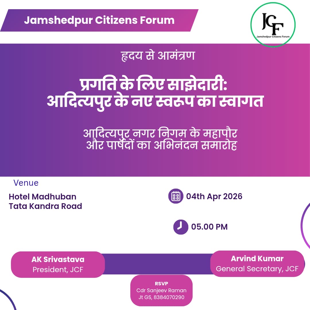 जमशेदपुर सिटीजंस फोरम के द्वारा आगामी 4 अप्रैल को मोटेल मधुबन में आदित्यपुर नगर निगम के नवोदित मेयर और पार्षदों का अभिनंदन समारोहपूर्वक करेगा. इस अभिनंदन समारोह की जानकारी फोरम के अध्यक्ष एके श्रीवास्तव और महासचिव पूर्व विधायक अरविंद कुमार सिंह ने दी. समारोह संध्या 5:00 बजे से आदित्यपुर स्थित मधुबन होटल में आयोजित किया गया है, जिसमें आदित्यपुर के सर्वांगीण विकास विषय पर एक गोष्ठी का भी आयोजन किया जाएगा.