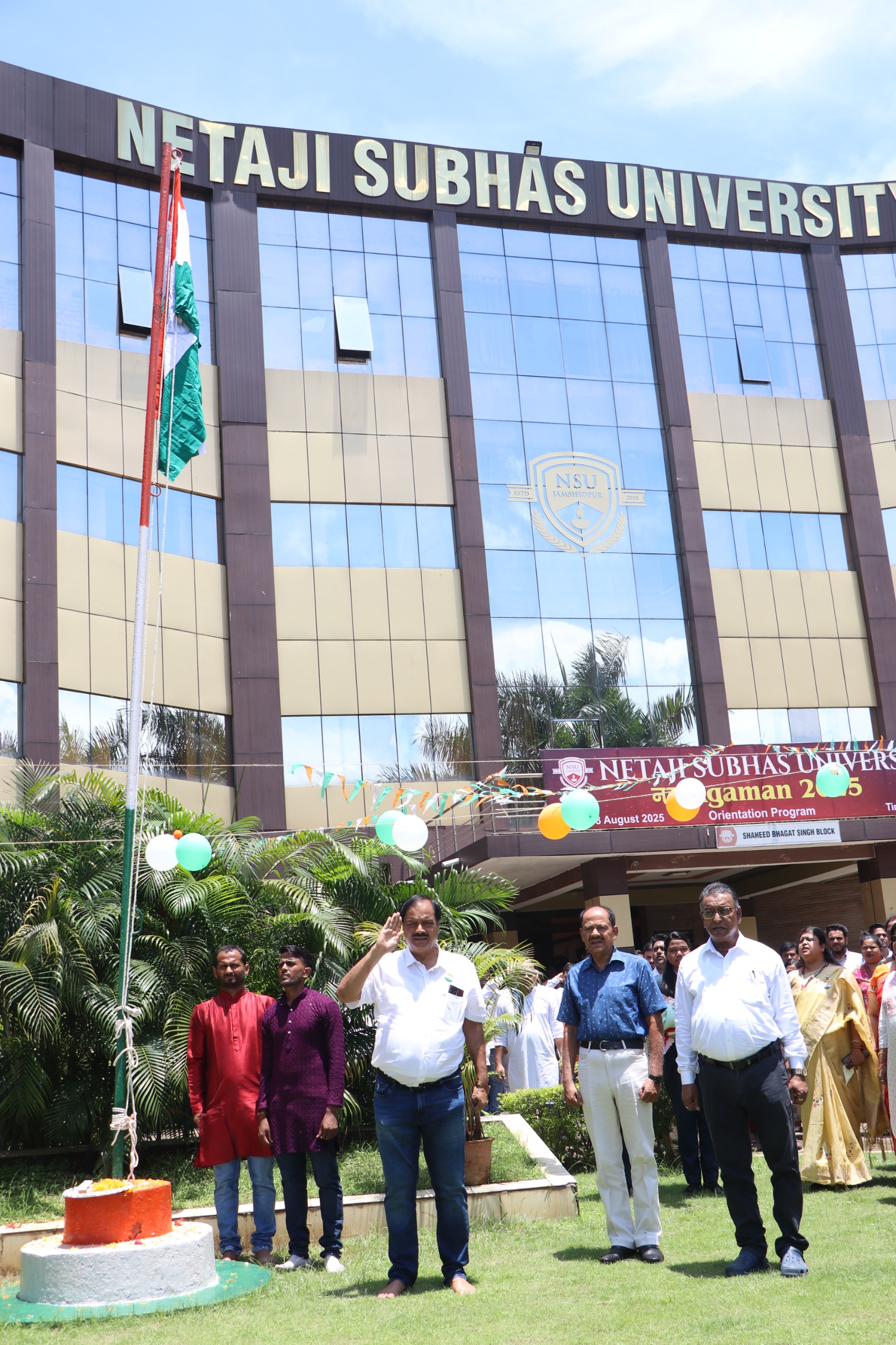 जमशेदपुर :- नेताजी सुभाष विश्वविद्यालय ने 15 अगस्त 2025 को भारत का 79वां स्वतंत्रता दिवस बड़े उत्साह, गर्व और गहरी देशभक्ति की भावना के साथ मनाया। इस अवसर पर विश्वविद्यालय परिसर राष्ट्रीय रंगों और एकता की भावना से सराबोर हो गया। समारोह में विश्वविद्यालय के प्रशासनिक और शैक्षणिक पदाधिकारी, आमंत्रित गणमान्य अतिथि, संकाय सदस्य, शिक्षकेत्तर एवं गैर शिक्षकेत्तर कर्मचारी तथा विश्वविद्यालय और नेताजी सुभाष पब्लिक स्कूल के विद्यार्थी बड़ी संख्या में उपस्थित रहे।