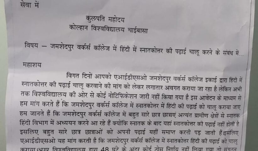 View More दीपावली,छठ एवं कार्तिक पूर्णिमा को लेकर अर्पण ने बुलाई बैठकजमशेदपुर वर्कर्स कॉलेज में हिंदी में स्नातकोत्तर की पढ़ाई चालू करने की मांग को लेकर एआईडीएसओ ने कुलपति को सौंपा ज्ञापन.