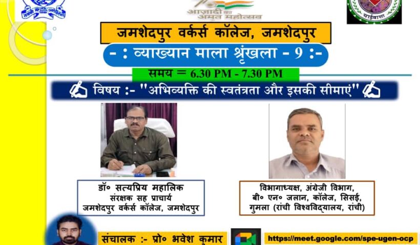 मानवीय क्रियाकलाप अभिव्यक्ति की स्वतंत्रता का परिचायक – डॉ० राधे श्याम सिंह जमशेदपुर (संवाददाता ):-वर्कर्स कॉलेज, जमशेदपुर द्वारा आजादी का अमृत महोत्सव बड़े धूम-धाम से…